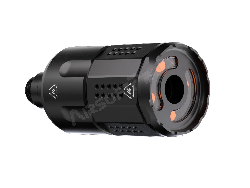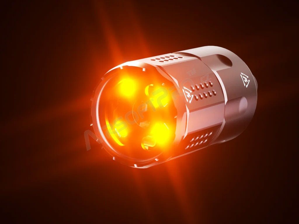 Thanks to four powerful 5 mm high brightness LEDs placed on the front side, the silencer can produce a spectacular imitation of a shot.
