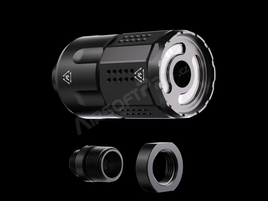 Compensatorul are un filet standard pentru mâna stângă M14. Pachetul include, de asemenea, un adaptor pentru pistol cu filet pentru mâna dreaptă M11. Acest lucru îl face utilizabil pe aproape orice pistol airsoft.