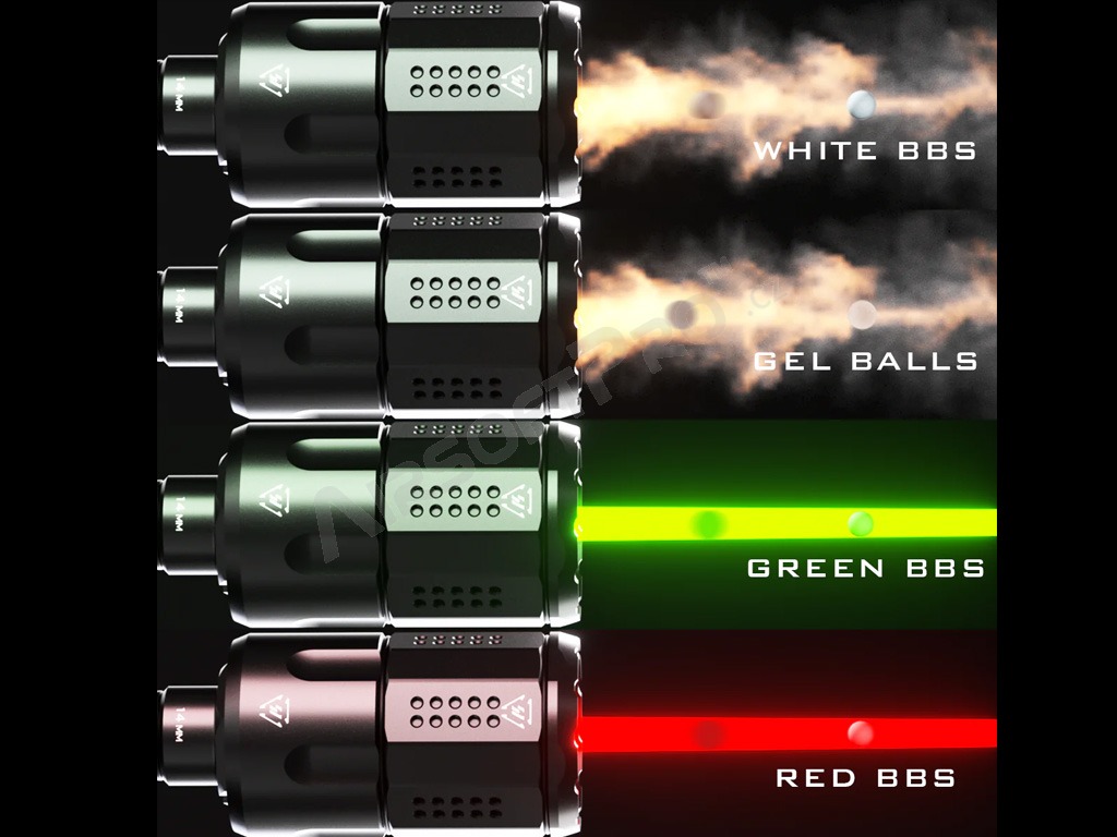 Silencer-ul poate aprinde atât bile de iluminare verzi și roșii , cât și bile Gel BB. De asemenea, le puteți folosi pe cele albe clasice, care, deși nu luminează, pot fi folosite într-un efect de împușcare simulată. Încercați diferite culori de BB-uri pentru a obține efecte diferite.