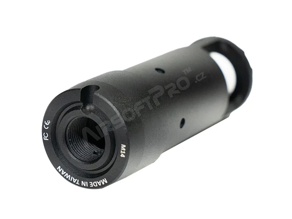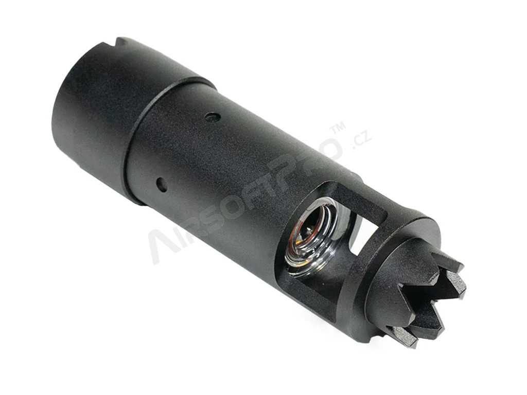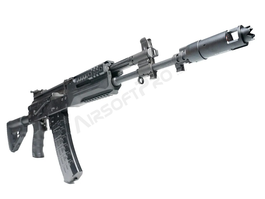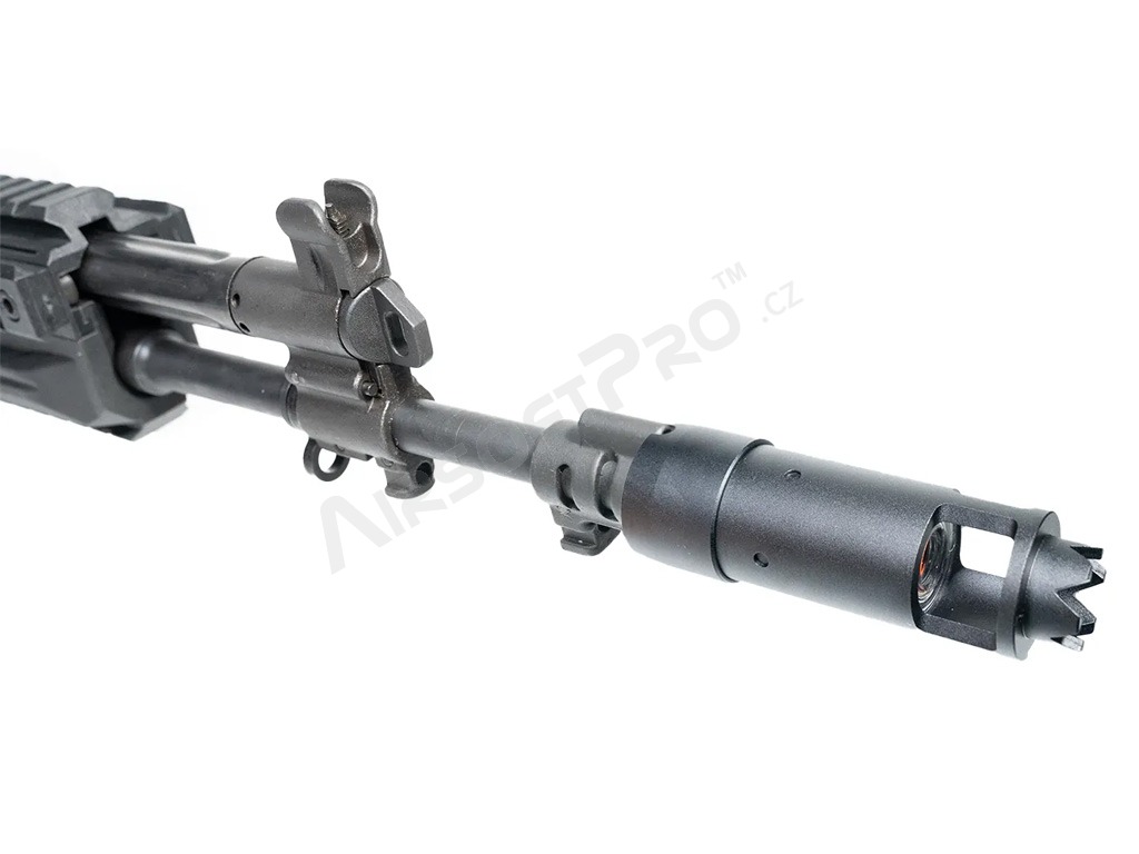 Flash hider-ul are forma amortizorului de zgomot al armelor din seria AK. Este puțin mai mare decât amortizorul clasic AK, dar este o copie fidelă a acestuia în ceea ce privește aspectul și, cel mai important, găzduiește unitatea de iluminare Blaster.
