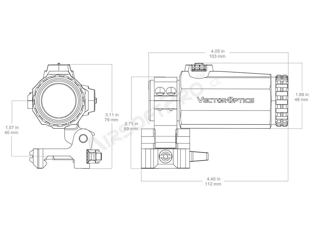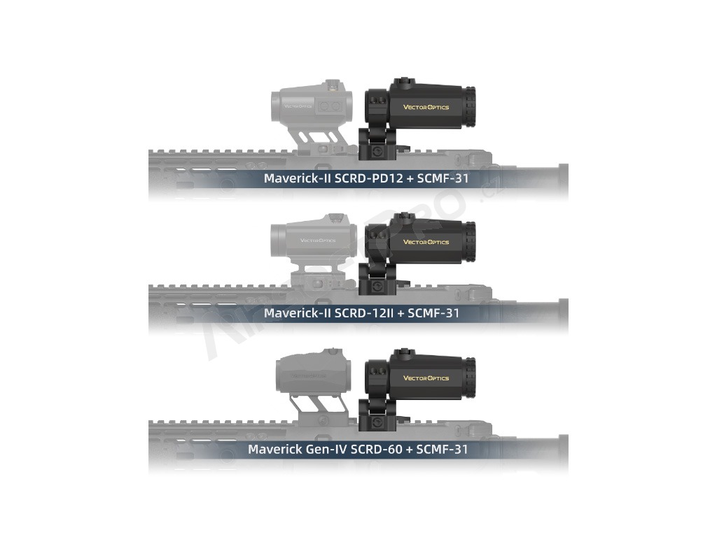 Vector Optics Maverick Gen III MIL 3x22 este o optică cu mărire 3x care se află în fața colimatorului (între colimator și trăgător). Aceasta mărește ținta atunci când se țintește prin colimator la distanțe mai mari. Atunci când se trage la distanțe mai mici, aceasta poate fi pur și simplu înclinată într-o parte și se poate ținti mai departe doar prin colimator.