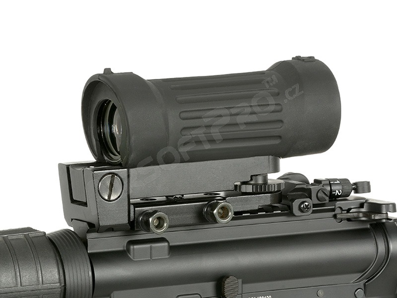Lunetă de pușcă durabilă și robustă de tip Elcan, fabricată din metal, cu un manșon de cauciuc pentru protecție împotriva deteriorării.