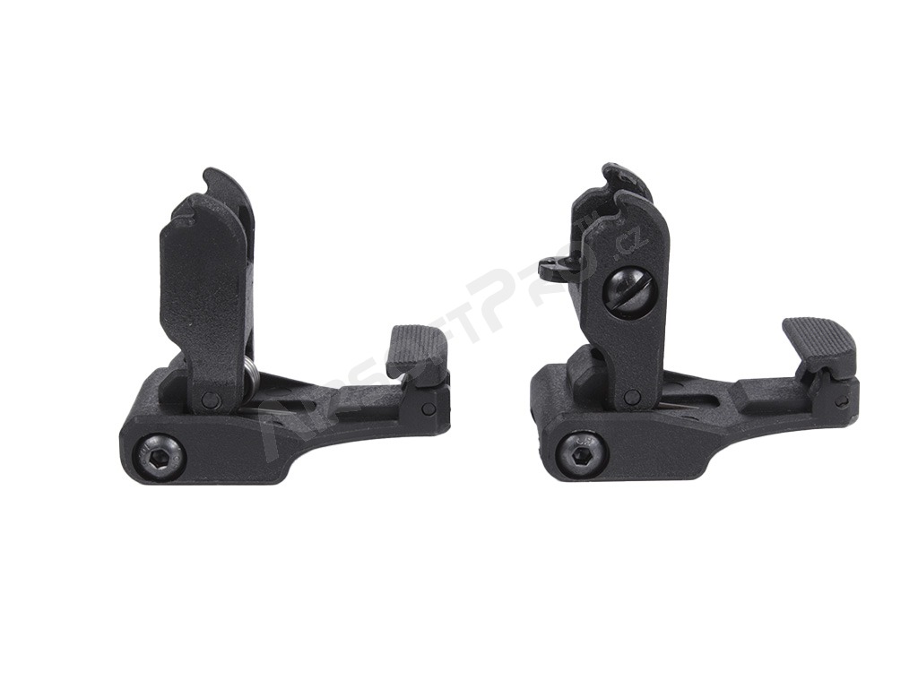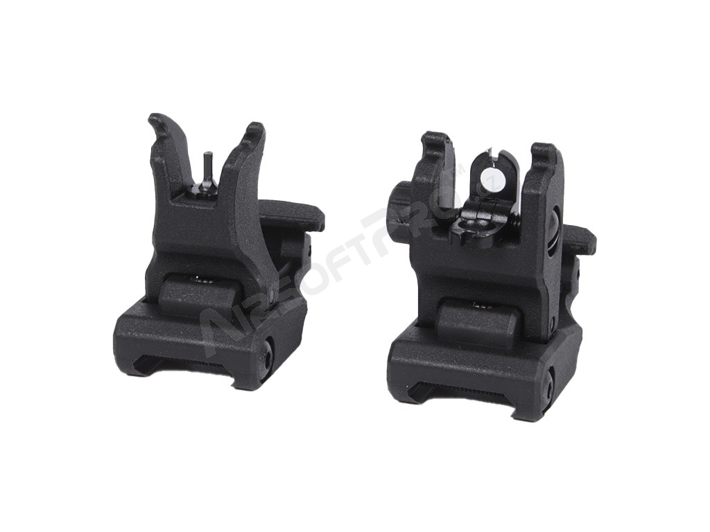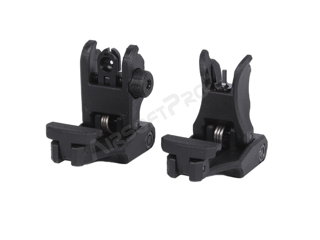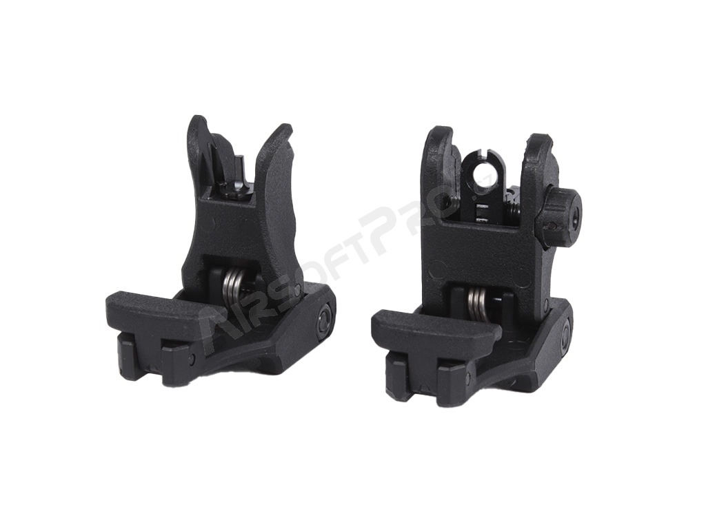 Mușcă din polimer și set de vedere. Este posibil să le atașați la șinele RIS comune. Setul este complet reglabil și pliabil.