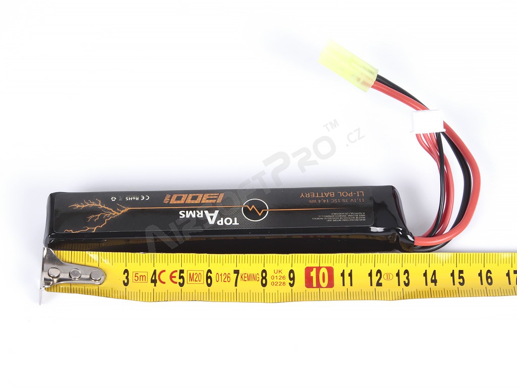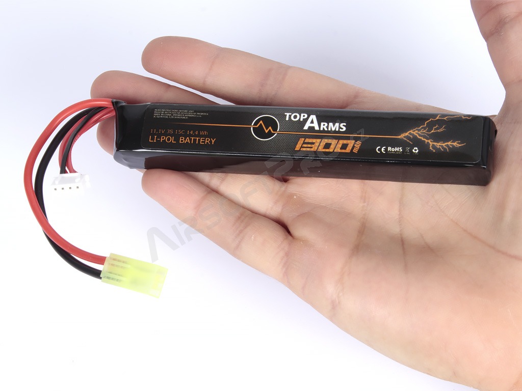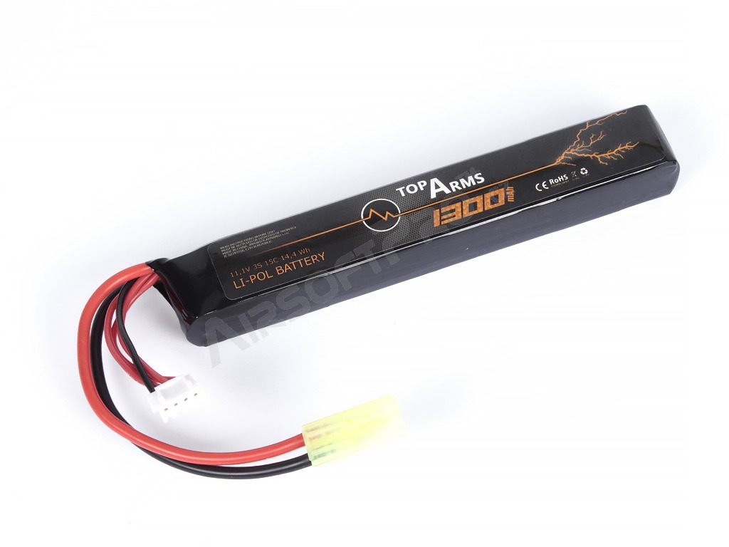 Baterie Li-Po de înaltă calitate 11,1 V 1300 mAh de la TopArms. Acumulatorul are un conector Mini Tamiya și poate fi încărcat numai cu un încărcător Li-Po cu balancer.