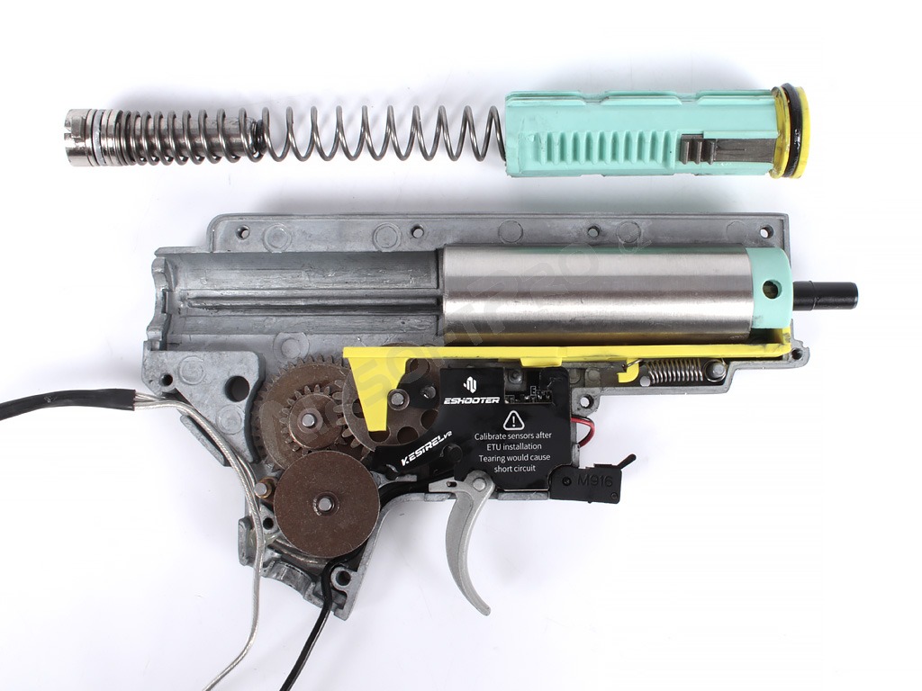 - MOSFET: direcționează energia bateriei direct către motor, ocolind contactele mecanice ale declanșatorului. Rezultatul este o cadență mai mare a armei și un răspuns mai rapid al declanșatorului.