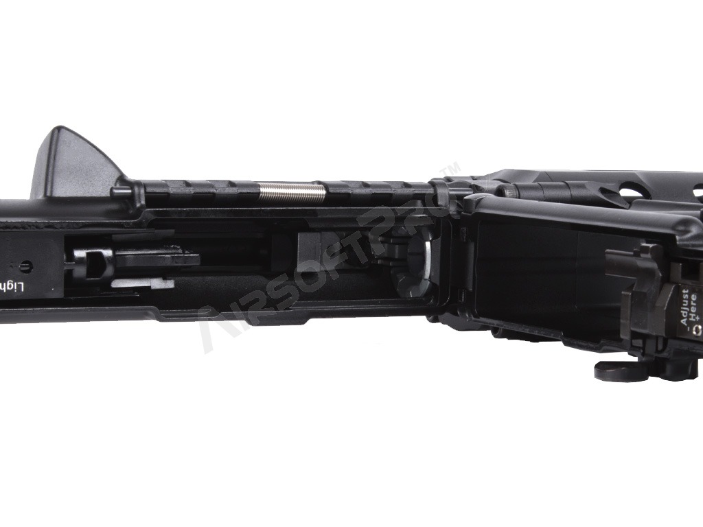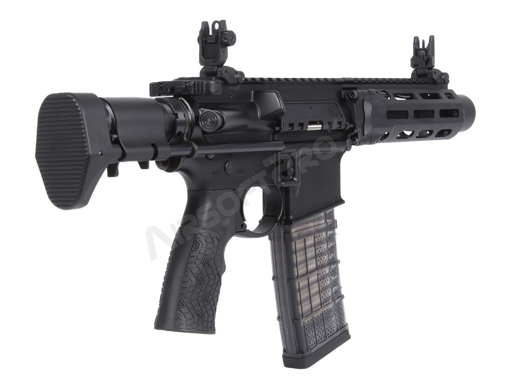Țeava exterioară compactă de 7" face din această pușcă o unealtă CQB ideală. Arma este echipată cu o crosă extensibilă din metal. Un încărcător licențiat Lancer Systems L5 AWM cu împingere de 30 de runde cu marcaje realiste adaugă autenticitate.