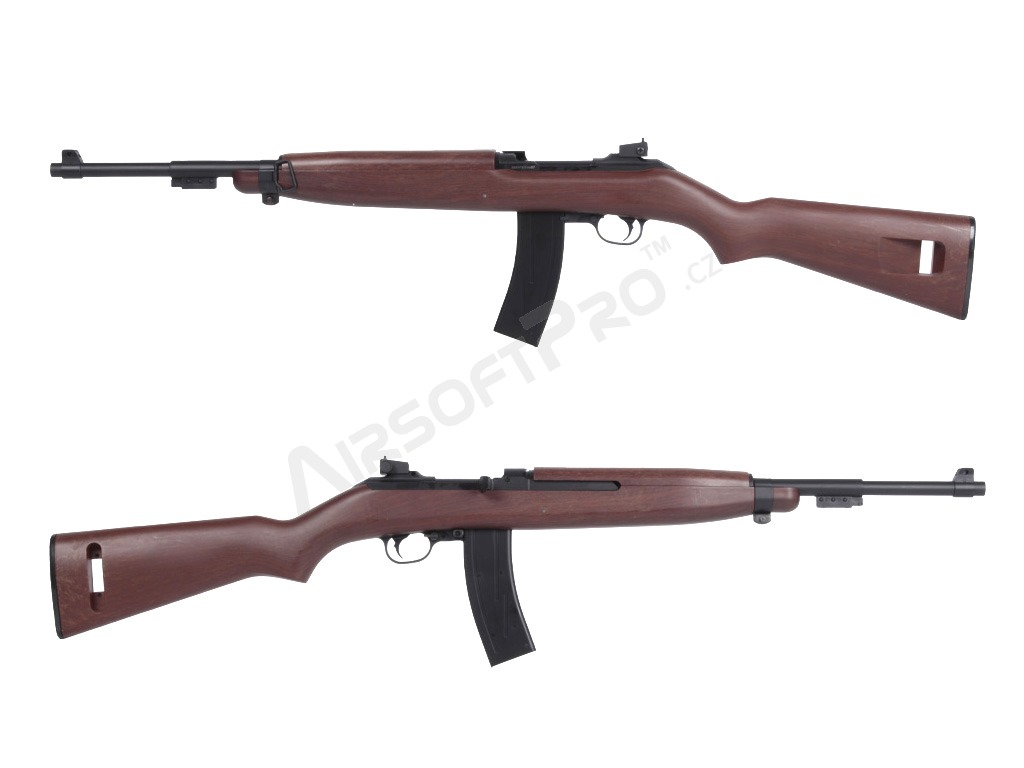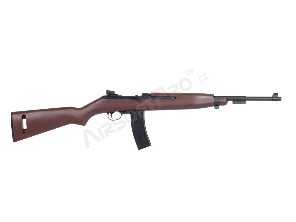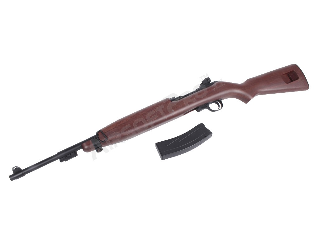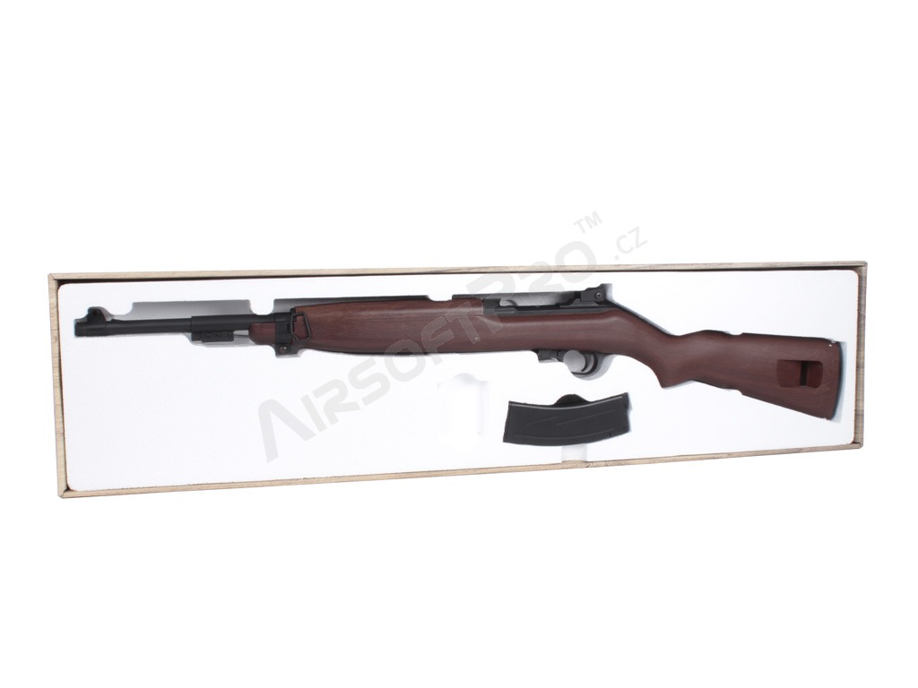 Istoria carabinei M1: Carabina M1 (United States Carbine, Caliber .30, M1) este o carabină ușoară, cu autoîncărcare, care a devenit rapid standard pentru soldații americani în timpul celui de-al Doilea Război Mondial. Simplitatea, greutatea redusă și designul compact au făcut-o populară în războaiele din Coreea și Vietnam; au fost dezvoltate, de asemenea, variante cu un mod complet automat (M2) sau o lunetă suplimentară cu infraroșu (M3). Spre deosebire de multe carabine, M1 a fost proiectat ca un sistem autonom și a devenit răspândit în sectoarele militar, polițienesc și civil. Această replică aduce aspectul clasic al carabinei în lumea airsoftului - inspirat, nu o copie istorică exactă.