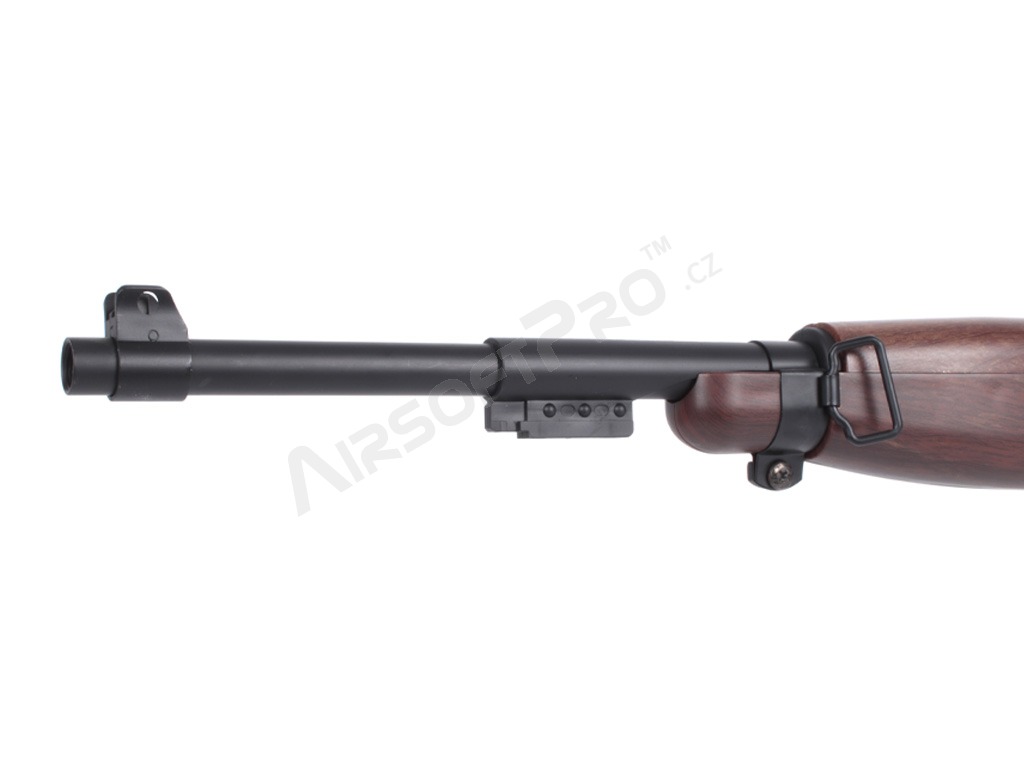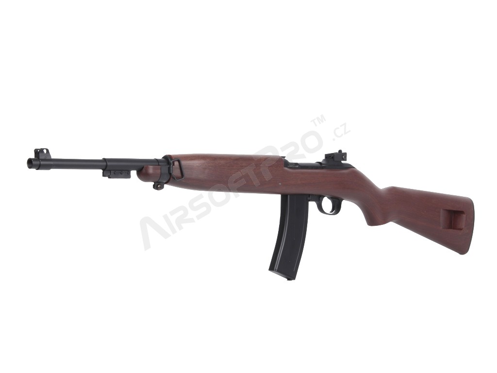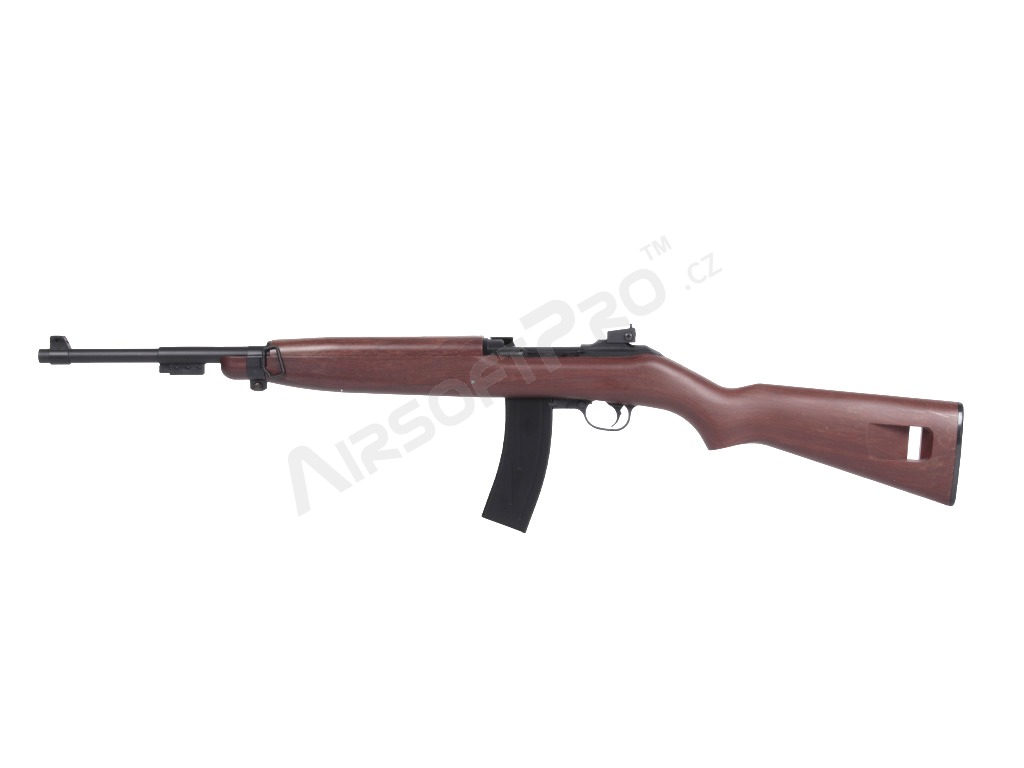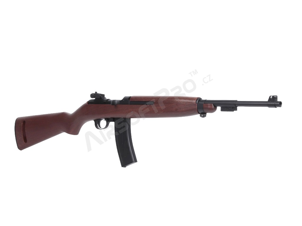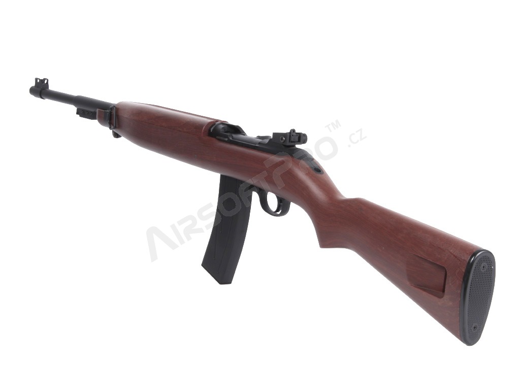 Istoria carabinei M1: Carabina M1 (United States Carbine, Caliber .30, M1) este o carabină ușoară, cu autoîncărcare, care a devenit rapid standard pentru soldații americani în timpul celui de-al Doilea Război Mondial. Simplitatea, greutatea redusă și designul compact au făcut-o populară în războaiele din Coreea și Vietnam; au fost dezvoltate, de asemenea, variante cu un mod complet automat (M2) sau o lunetă suplimentară cu infraroșu (M3). Spre deosebire de multe carabine, M1 a fost proiectat ca un sistem autonom și a devenit răspândit în sectoarele militar, polițienesc și civil. Această replică aduce aspectul clasic al carabinei în lumea airsoftului - inspirat, nu o copie istorică exactă.