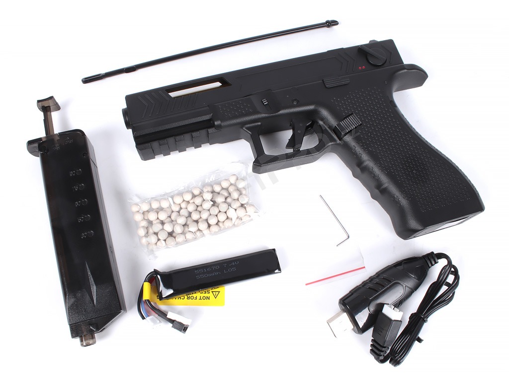 În pachet veți găsi: pistol, încărcător, baterie, cablu de încărcare (USB), speedloader și ștergător.