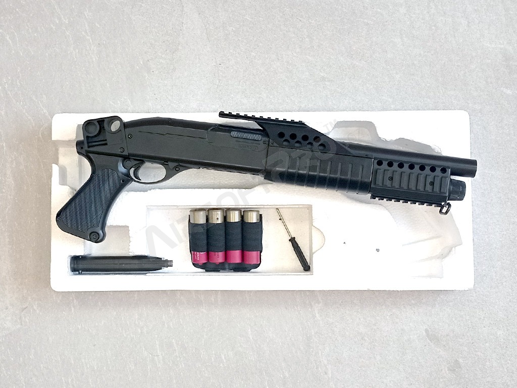 M180-A1 CQB Airsoft Shotgun este o pușcă cu pompă ușoară, ușor de manevrat, potrivită în special pentru începători și tir recreațional. Construcția complet din plastic cu mâner de pistol asigură o prindere confortabilă și o greutate redusă, arma trage un pelet pe fiecare apăsare a trăgaciului.