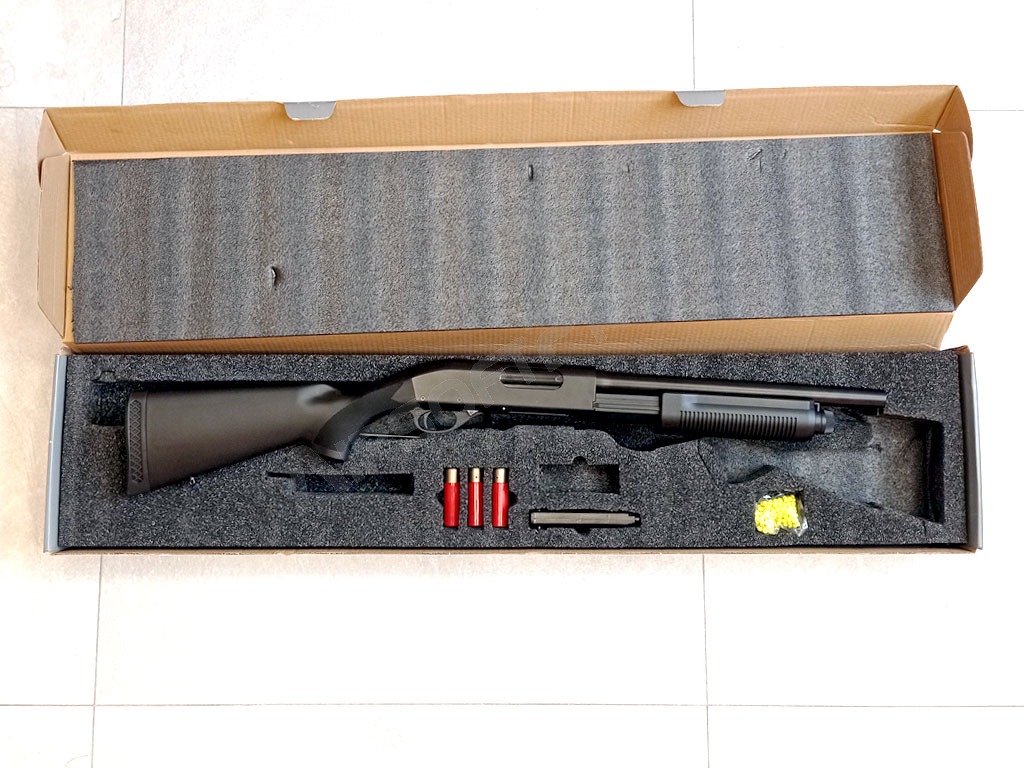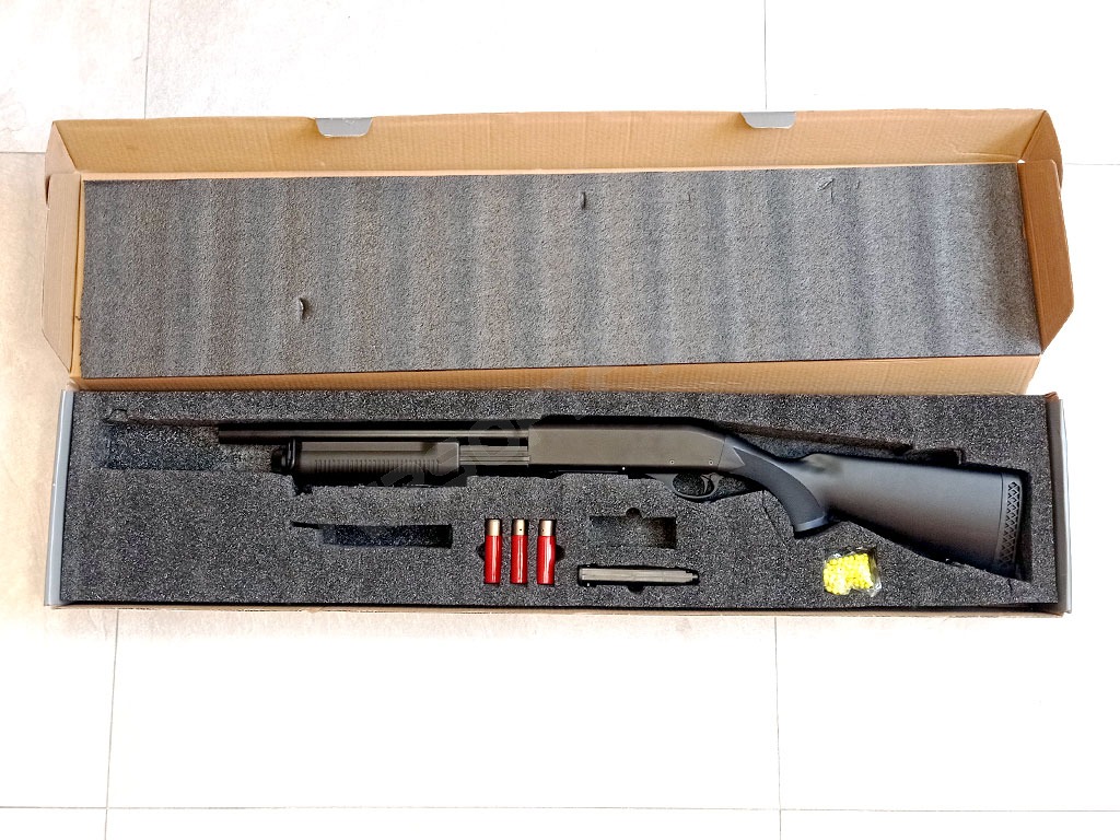 Replică airsoft a unei puști manuale la scara 1:1. Corpul, inclusiv țeava, este din metal cu finisaj mat. Crosa și antebrațul de încărcare sunt fabricate din plastic ABS durabil. Arma este echipată cu ochiuri pentru suspendarea praștii. Această pușcă de vânătoare utilizează cartușe de imitație în locul unui încărcător convențional. Peletele sunt încărcate în cartuș cu ajutorul unui încărcător rapid, care este apoi introdus în armă. Capacitatea cartușului este de 30 de peleți. Pușca funcționează pe principiul manual, în care antebrațul trebuie să fie armat într-o mișcare realistă înainte de a trage fiecare foc. Pușca trage trei alice pe tragere. Arma are, de asemenea, o siguranță funcțională.