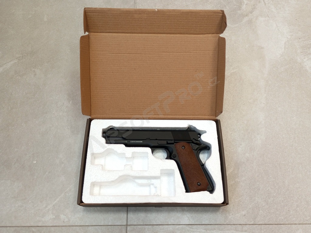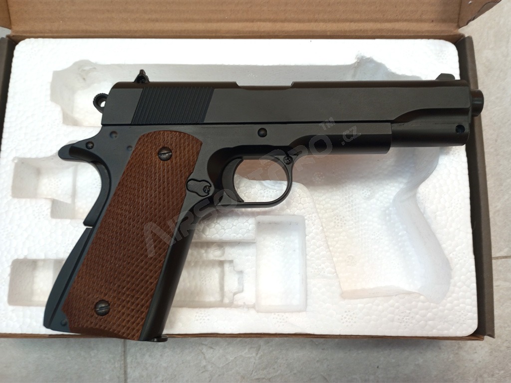 1911A1 pistol manual de la Well. Principala diferență față de alte pistoale manuale este materialul. Pistolul este complet metalic! Deci se simte mult mai realist în mână. Pistolul este armat înainte de fiecare împușcătură prin glisarea manuală a glisorului înapoi. Magazinul poate conține până la 42 de peleți care sunt ușor de introdus printr-o gaură blocabilă în partea din spate a încărcătorului. Datorită țării de origine (China), este posibilă o uzură mai rapidă a pieselor interne. Granulele recomandate sunt de 0,16 - 0,20 g.