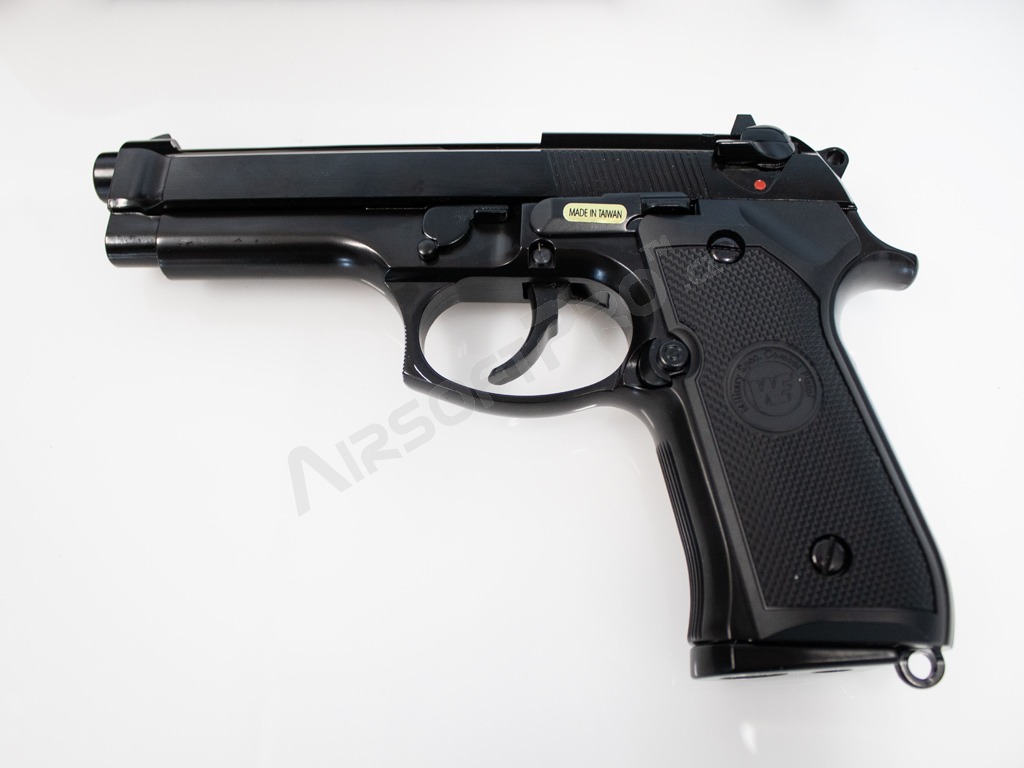 Replica perfect detaliată și complet metalică a pistolului clasic M92. Este o armă acționată cu gaz și imită în mod realist mișcarea glisierei la tragere. Așa-numitul sistem Blow back. Gazul este umplut într-o magazie cu o capacitate de 25 de peleți. Arma este capabilă să tragă aproximativ 30-40 de bile pe fiecare umplere cu gaz. Greutatea optimă a muniției este de 0,20 - 0,23 g. Aceasta este o armă de a doua generație.
