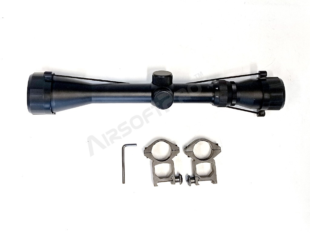 Optică durabilă complet metalică cu diametru de 40 mm și mărire 3x-9x. Capace pentru lentile incluse. Inele de montare înalte de 25mm ARE incluse. Riflescope poate fi montat pe orice șine de montare standard de 22m.
