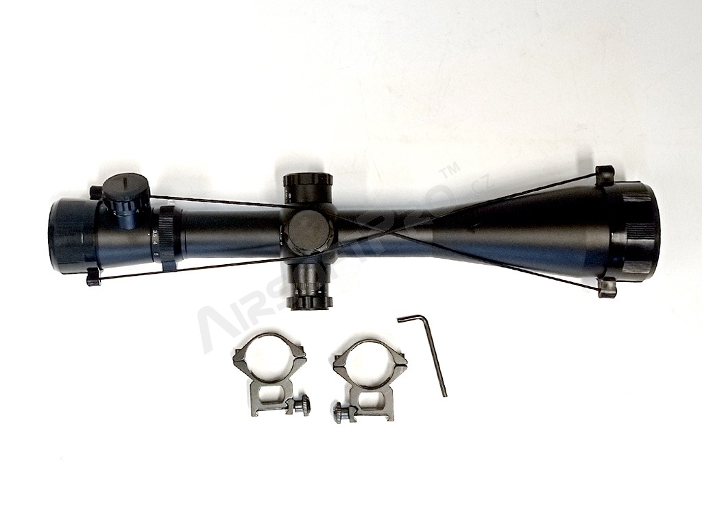 Luneta de pușcă masivă cu design complet metalic, cu diametru de 50 mm și mărire 3,5x-10x. Permite reglarea crucii în ambele axe. De asemenea, poate fi iluminată în roșu. Baterie CR2032 NU este inclusă.