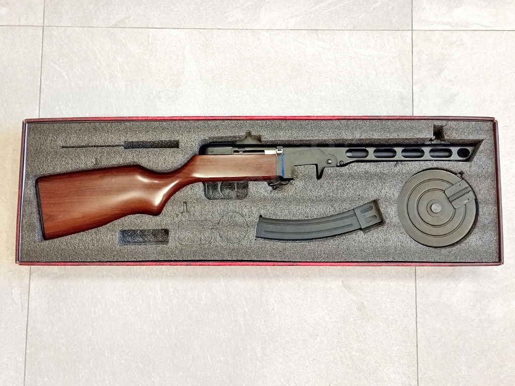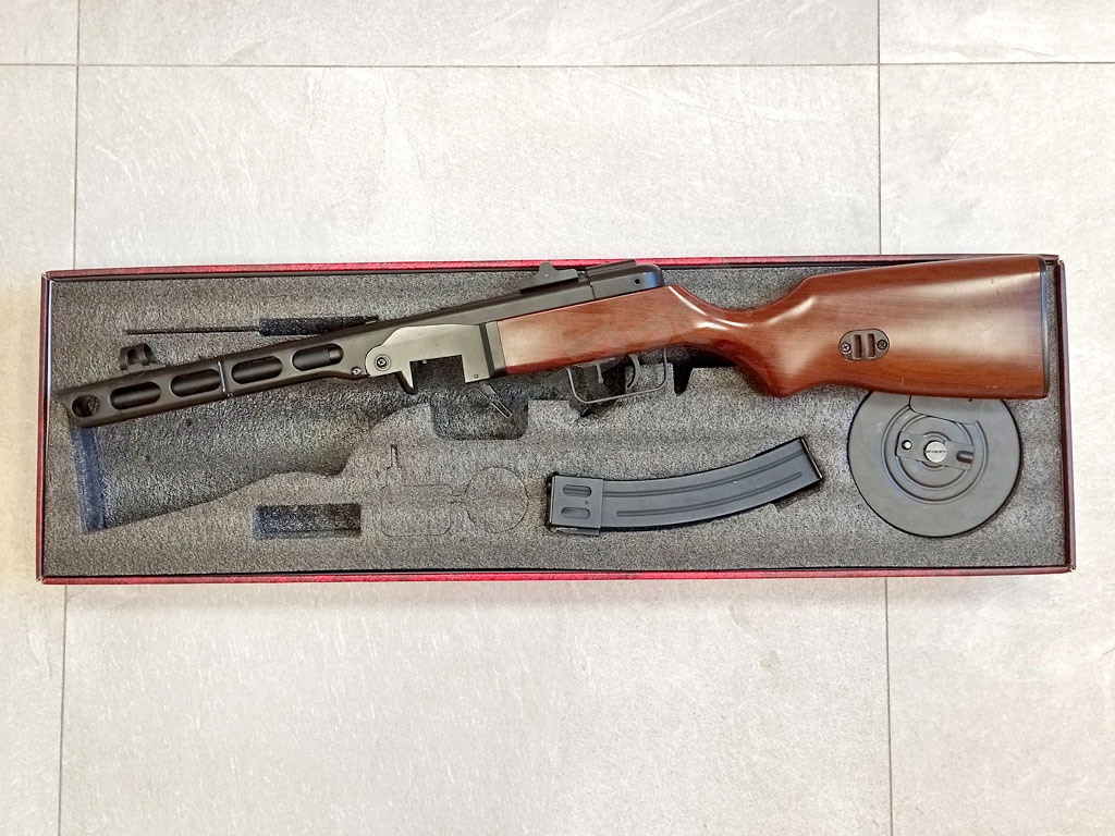 Acest clasic printre armele celui de-al Doilea Război Mondial nu are nevoie de o lungă prezentare. PPSh, sau "Spagin" a fost o armă tipică Armatei Roșii. Această replică este realizată conform modelului său real. Arma este fabricată din oțel și imitație de lemn din plastic. De asemenea, are un blowback electric care mișcă nu numai maneta de armare a culasei, ci și fereastra de eliberare a culasei atunci când se trage.