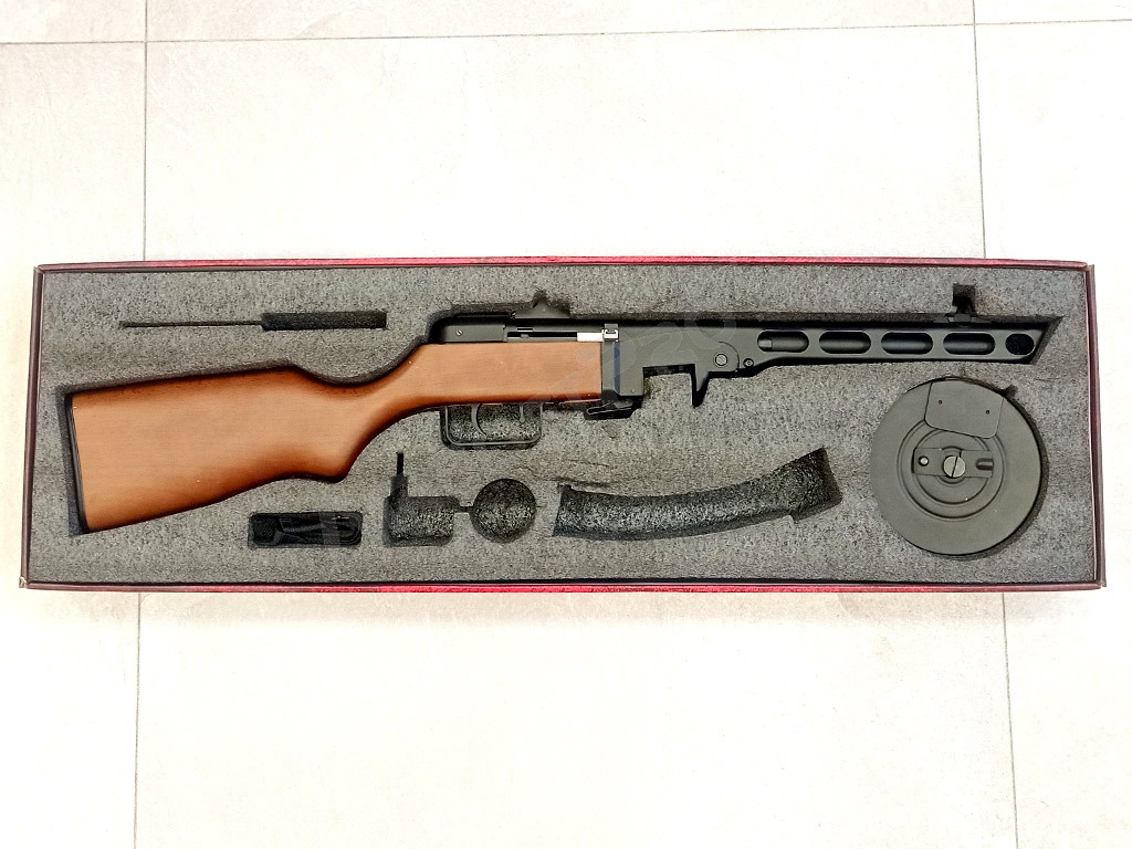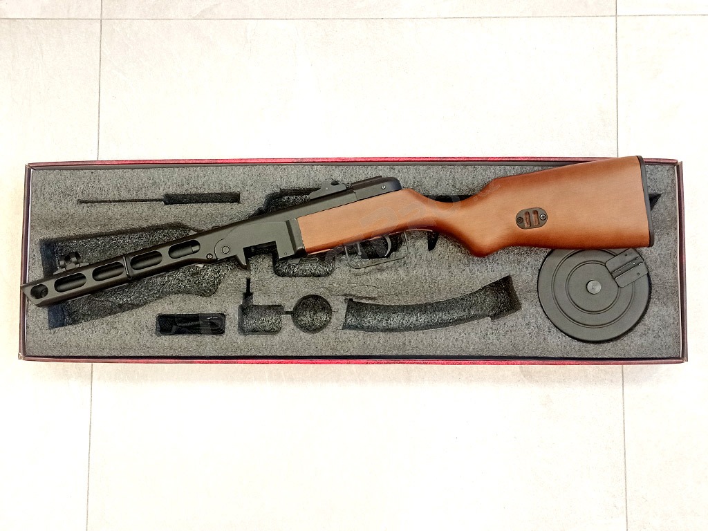 Acest clasic printre armele celui de-al Doilea Război Mondial nu are nevoie de o lungă prezentare. PPSh sau "Spagin" a fost o armă tipică pentru Armata Roșie. Această replică este realizată conform modelului său real în întregime din metal și lemn adevărat. De asemenea, are un blowback electric care mișcă nu numai maneta de armare a culii, ci și fereastra de ejecție a culii atunci când se trage. Pistolul are lemn foarte bine lucrat și un corp ștanțat realist.