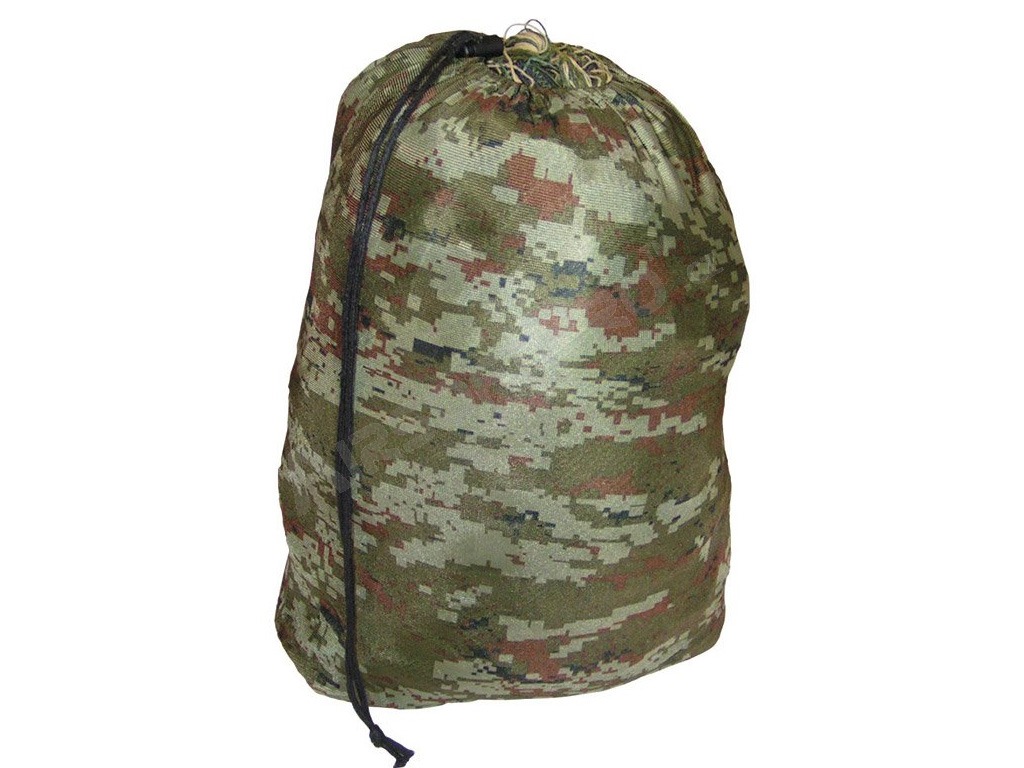 Vine într-un sac de camuflaj la îndemână, de mărimea unui sac de dormit.