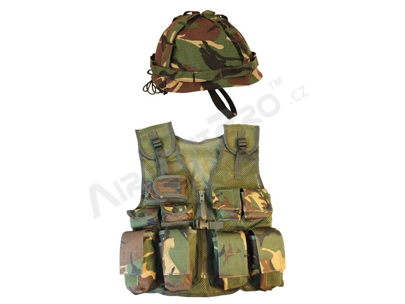 Alegerea perfectă pentru micii exploratori! Setul pentru copii include o vestă și o cască de asalt pentru copii cu un model de camuflaj DPM (Disruptive Pattern Material - similar cu modelul Woodland) - ideal pentru jocuri în aer liber sau airsoft.