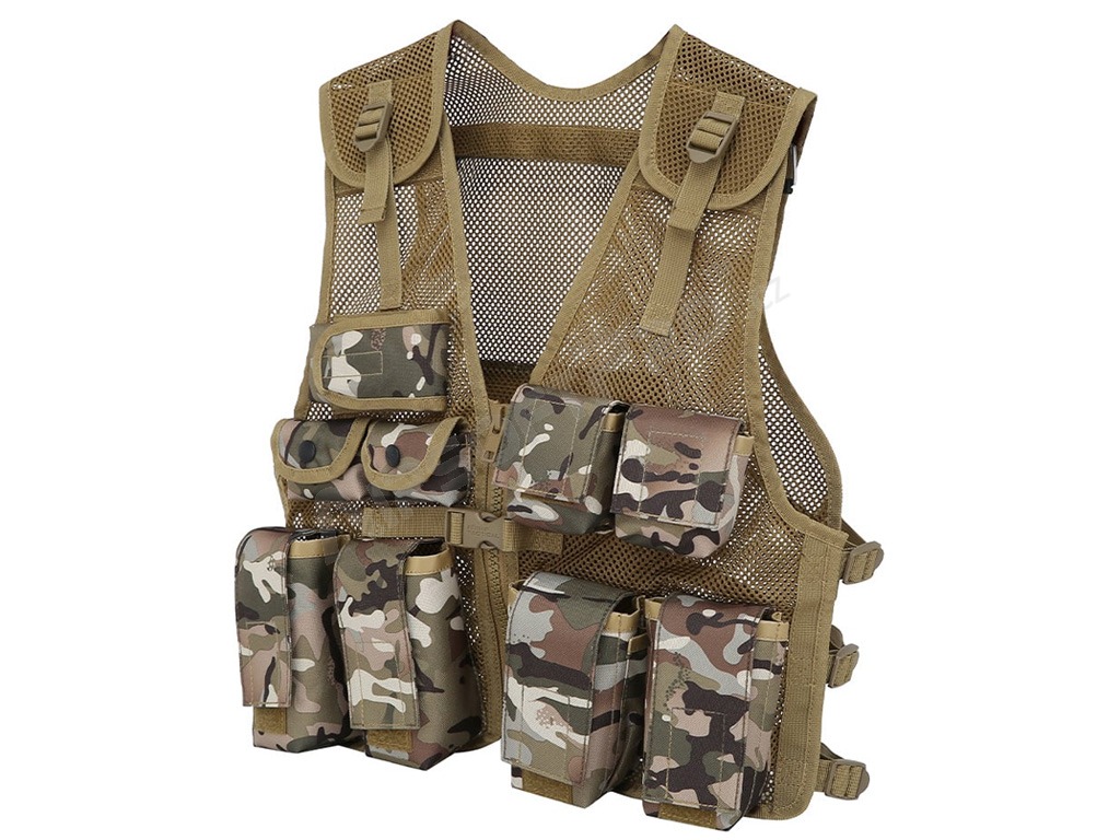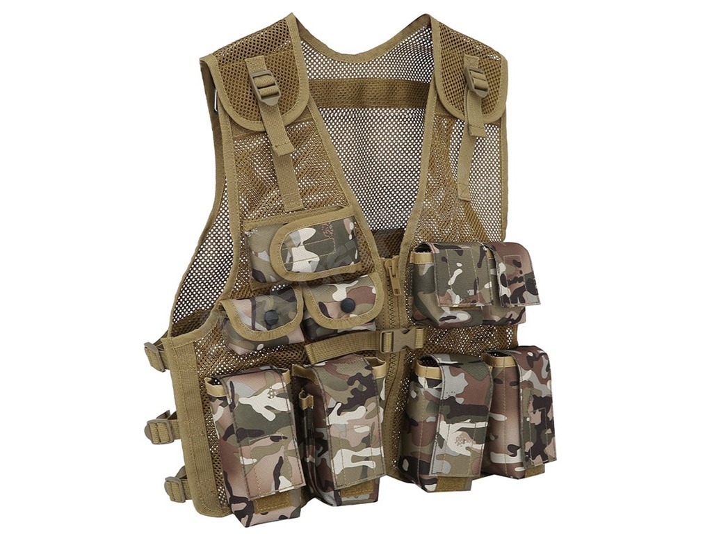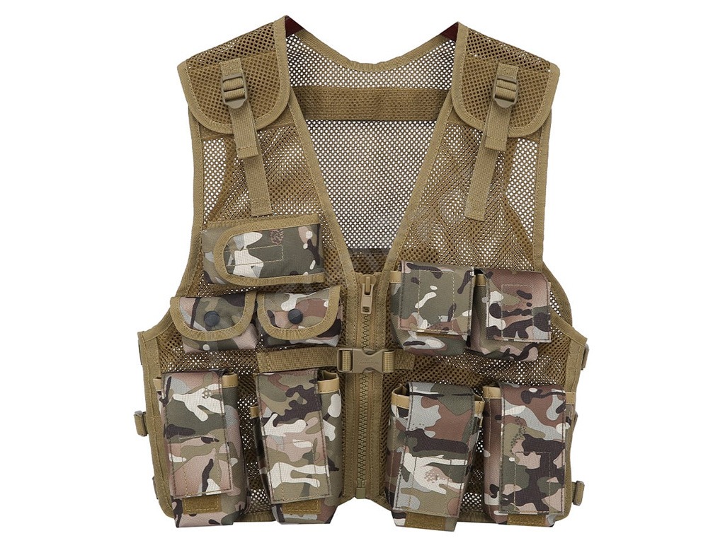 Are plasă ușoară, respirabilă, cu curele reglabile pe umeri, în față și pe laterale. Are o închidere cu fermoar cu cataramă cu eliberare rapidă și 9 buzunare pe față. Vesta este fabricată din material Tac-Poly 600D, ceea ce o face rezistentă și durabilă și are o dimensiune universală.