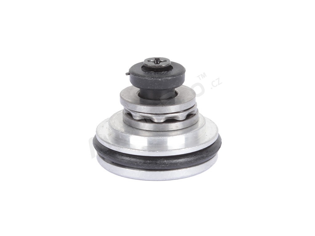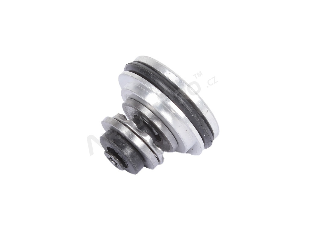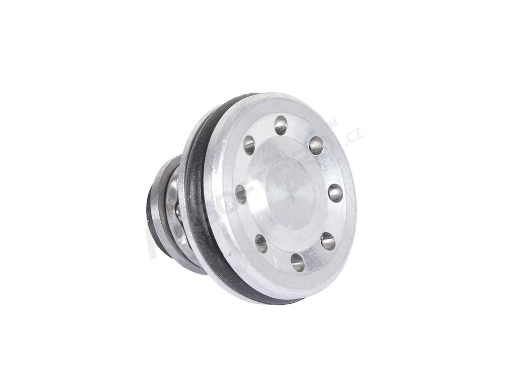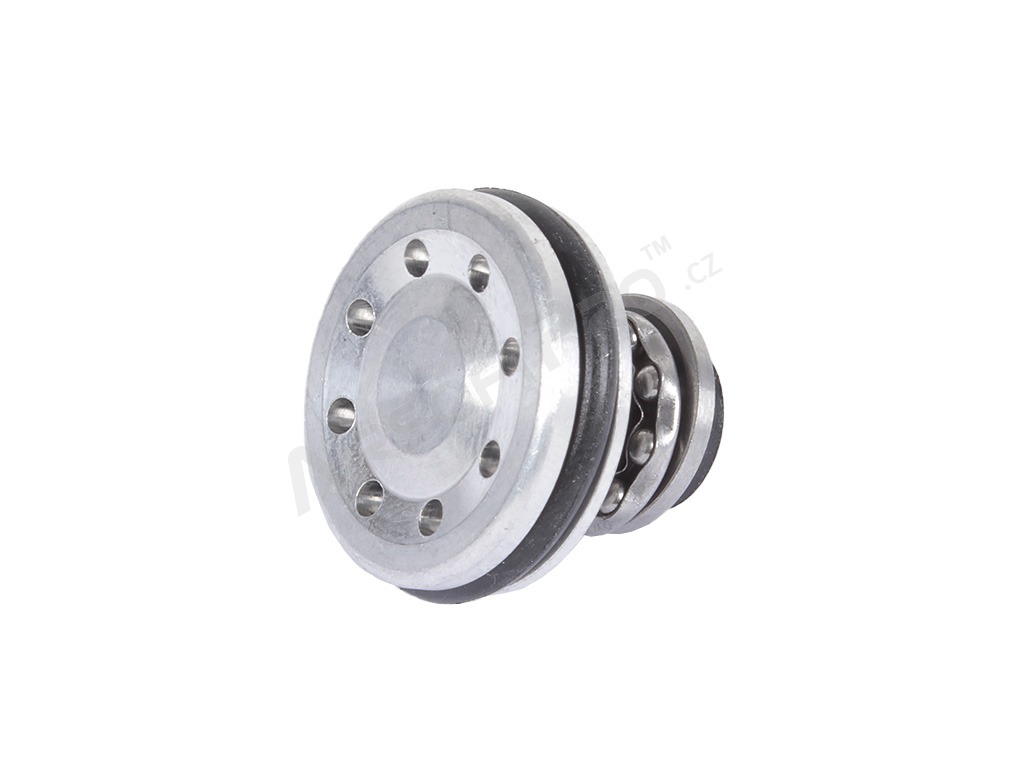 Cap de piston din aluminiu cu funcție anti-presiune și rulment, conceput pentru modernizarea armelor airsoft. Datorită prelucrării CNC oferă dimensiuni precise și durabilitate mai mare în comparație cu piesele standard din plastic (12 g).