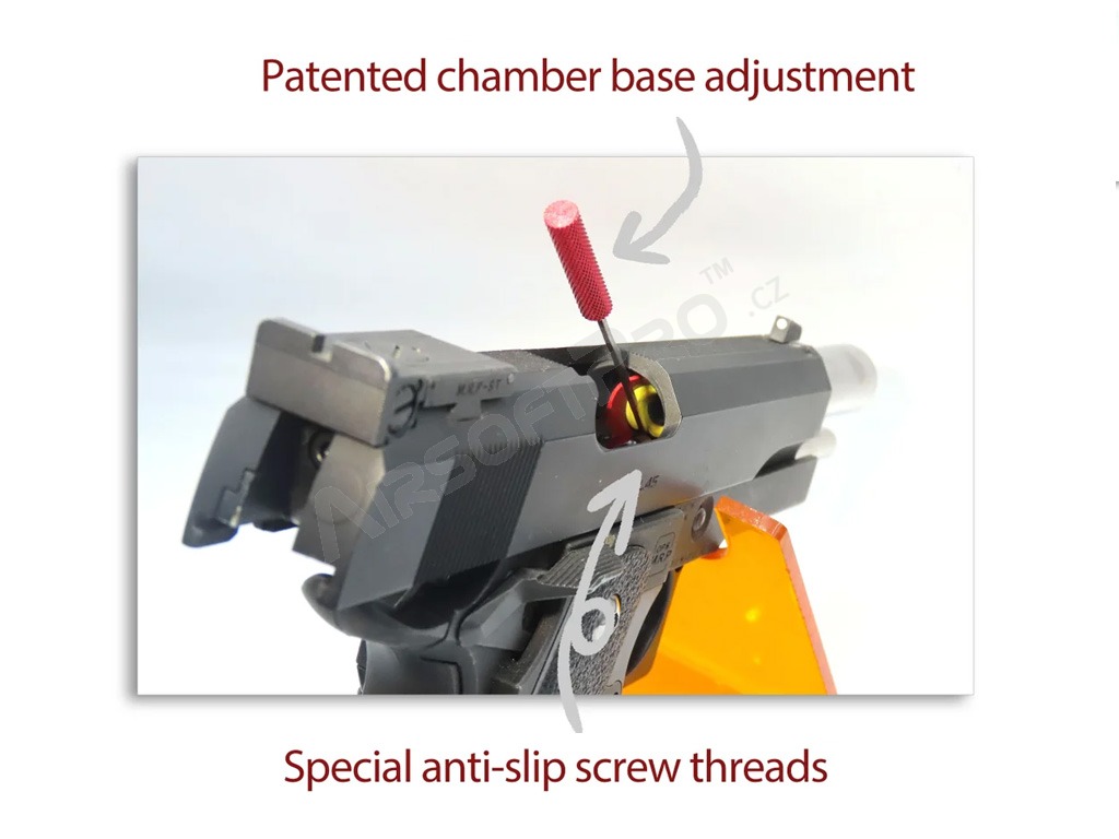 Spre deosebire de metoda tradițională, hop-up-ul poate fi reglat direct prin partea de jos a camerei (folosind o cheie Allen de 1,5 mm), fără a fi nevoie să scoateți glisiera armei, crescând considerabil confortul și eficiența. Presiunea este gestionată de sistemul TDC - o rolă de presiune largă împinge perpendicular pe banda de cauciuc, asigurând o presiune mai bună pe întreaga suprafață a benzii de cauciuc Hop-Up.