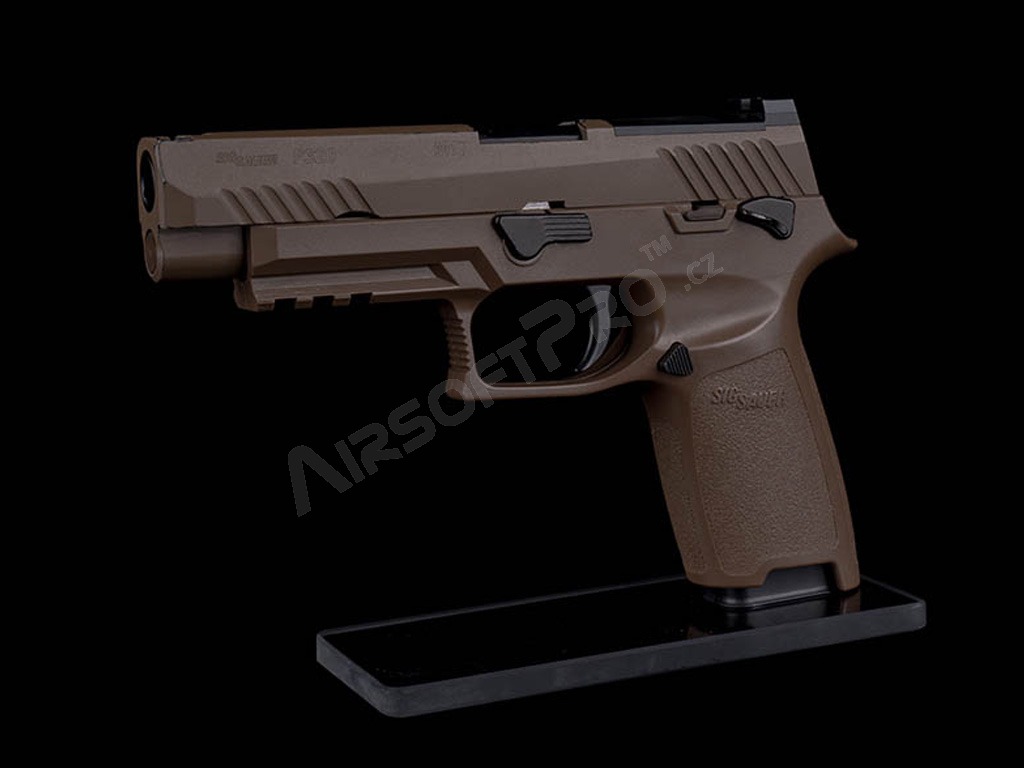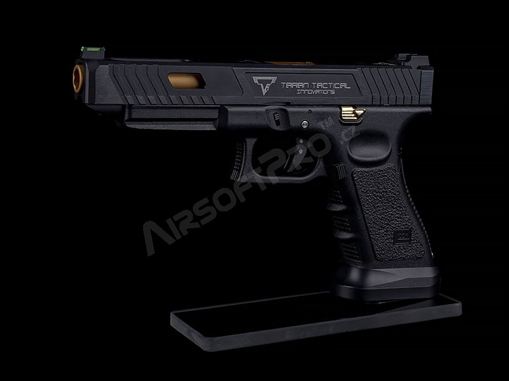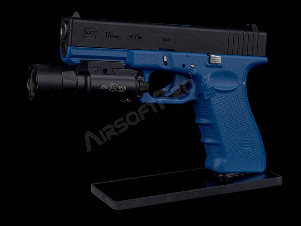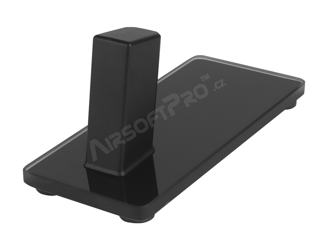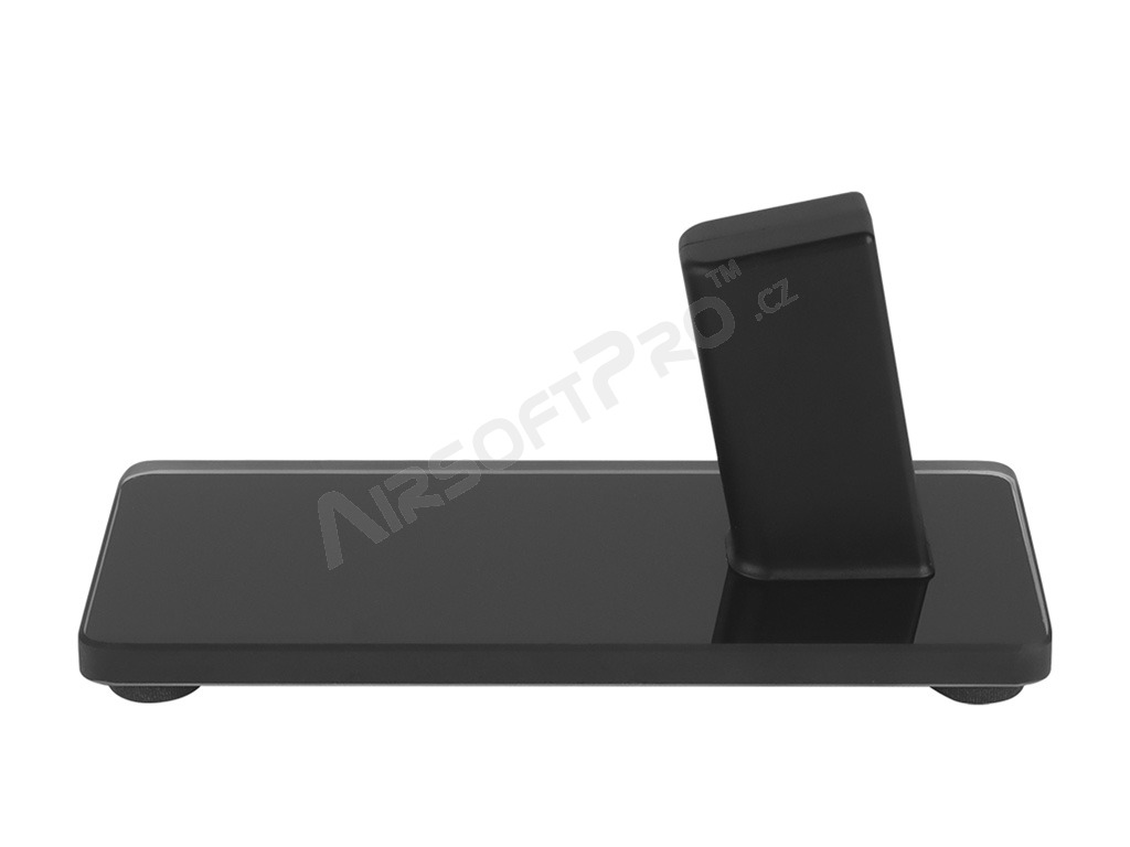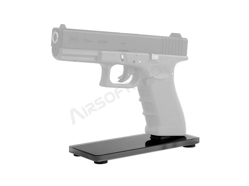 Suportul utilizează un puț pentru încărcător pentru montarea pistolului. De asemenea, baza din sticlă accentuează elegant aspectul pistolului expus. Corpul suportului este fabricat din plastic ABS, în timp ce baza este fabricată din sticlă pentru un efect vizual maxim.