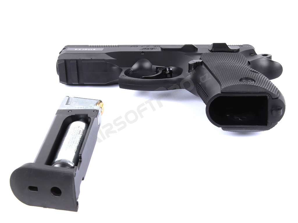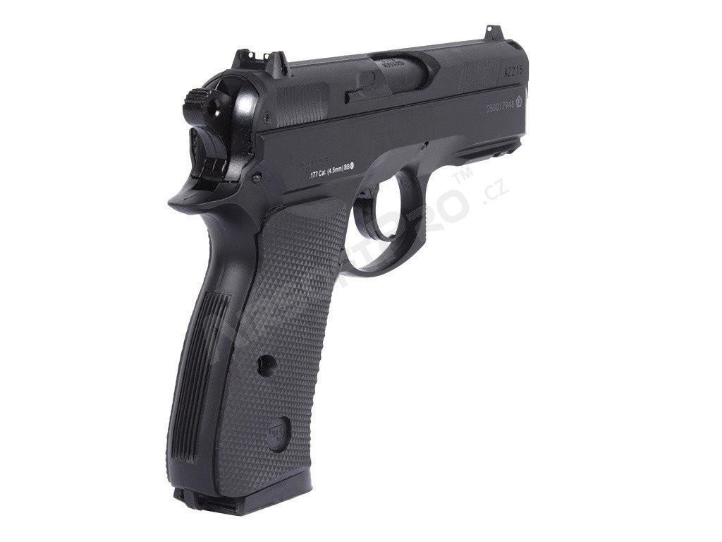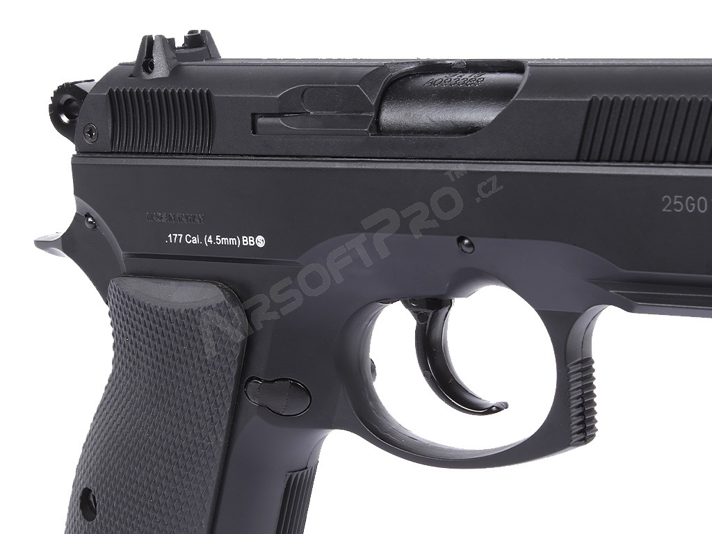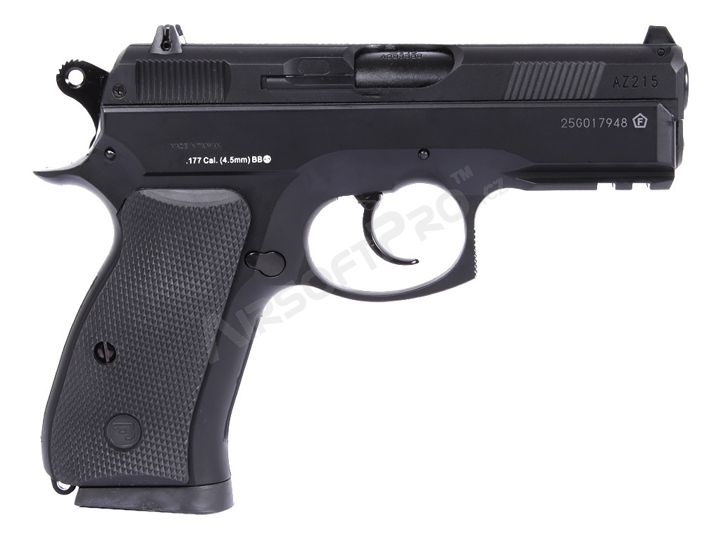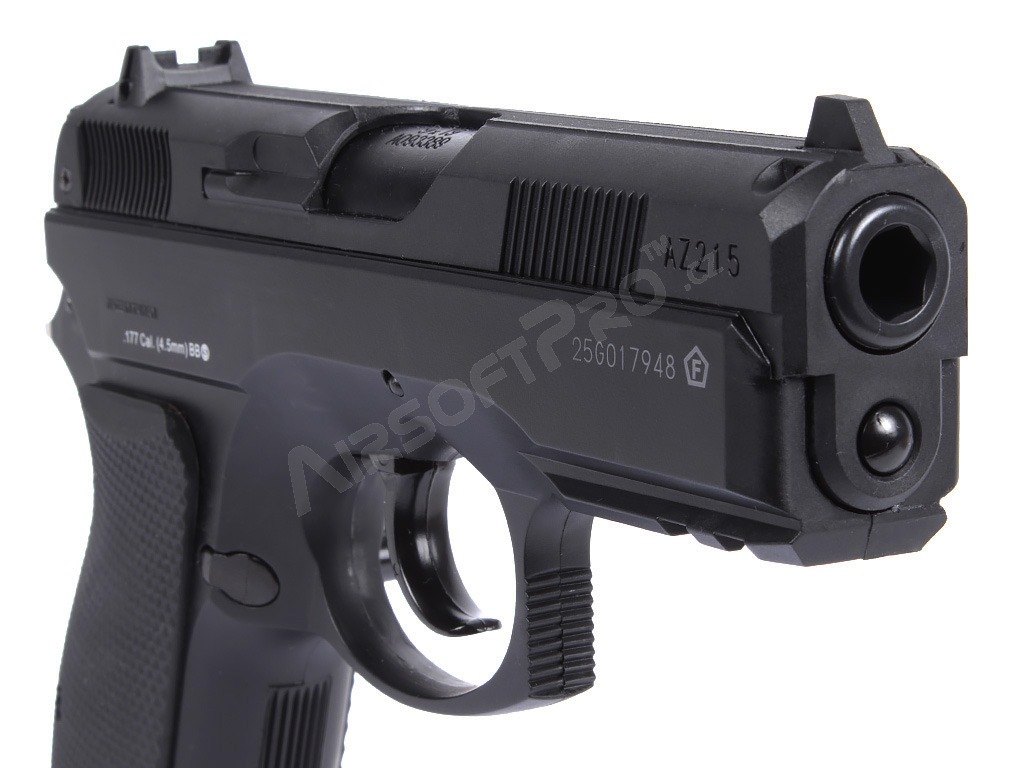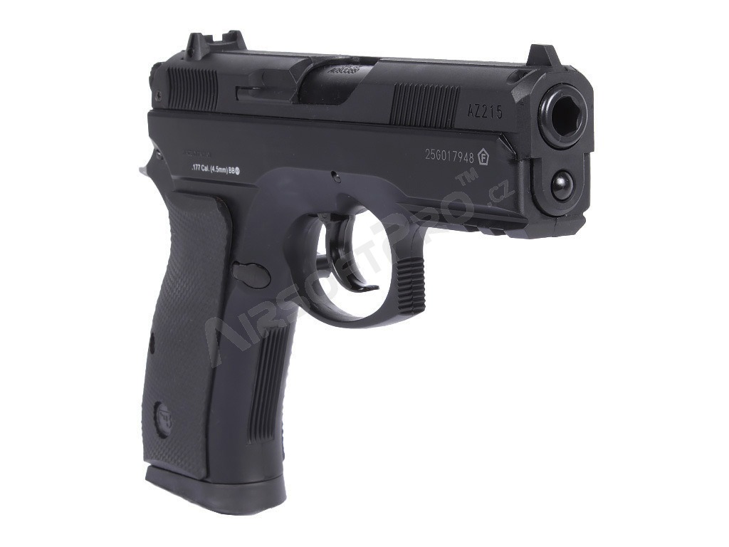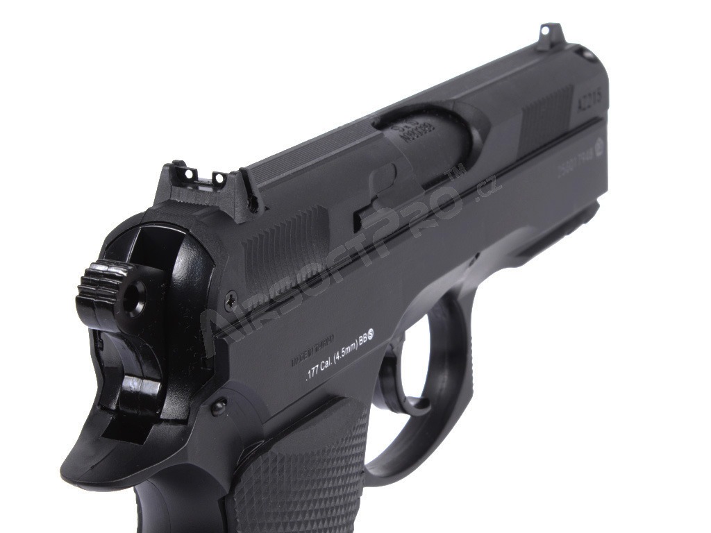 O replică operată cu aer CO2 a legendarului CZ 75D Compact, cu o culată metalică pentru alice de 4,5 mm.