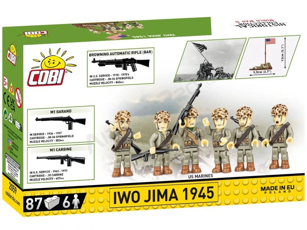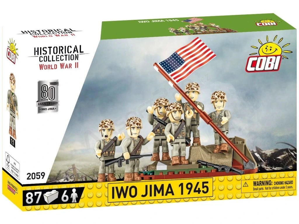 Setul include un model al vârfului stâncos al Muntelui Suribachi, un steag american imprimat, realist, pe un stâlp lung, 6 figuri de soldați americani în uniforme, cu diferite expresii și poziții ale corpului, toate detaliile fiind imprimate direct pe zaruri, fără utilizarea de autocolante, și o etichetă decorativă "Iwo Jima 1945" pentru expunerea pe un raft.