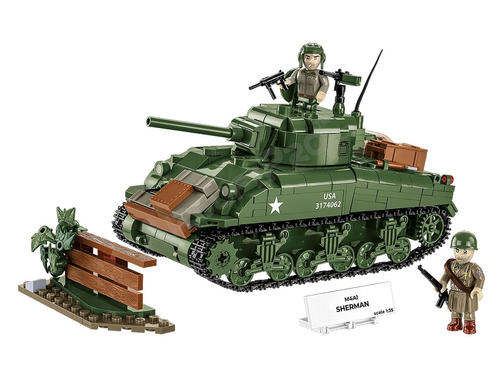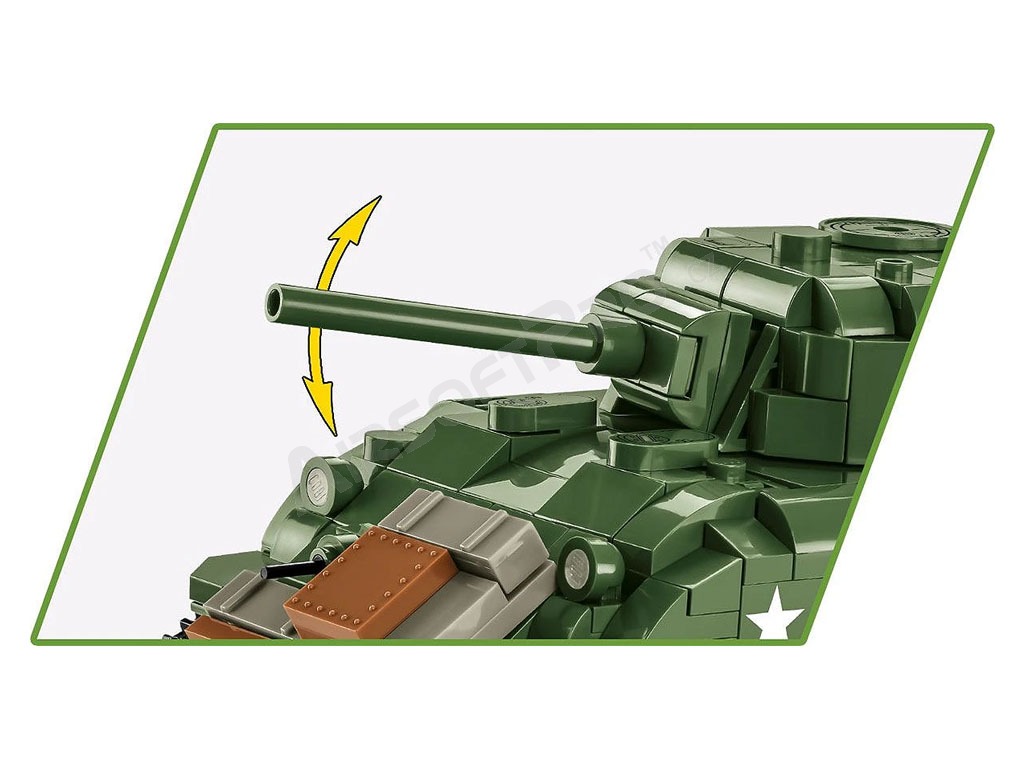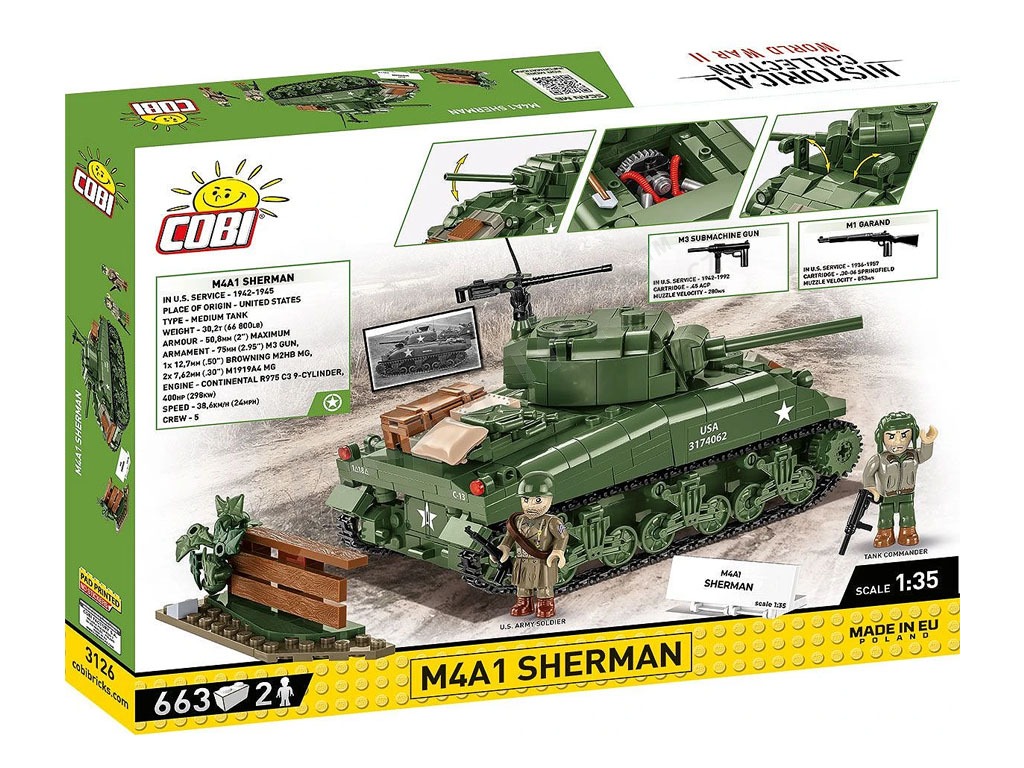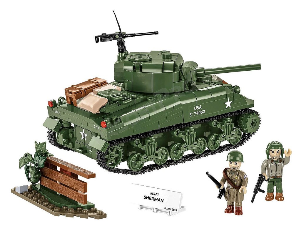 M4 Sherman a fost tancul mediu american de bază produs în timpul celui de-al Doilea Război Mondial. Acest kit COBI este proiectat cu atenție la scara 1:35 și constă din 663 de cărămizi. Tancul are șine funcționale, o turelă rotativă, un tun mobil, o trapă de deschidere și un capac de serviciu cu un motor fals în interior. Setul include două figuri - un tanchist american cu cască și mitralieră M3 "Grease Gun" și un infanterist îmbrăcat într-o haină călduroasă cu pușcă M1 Garand. Acesta este completat cu elemente de mediu: o secțiune de gard cu un gard de tufișuri, care dă setului atmosfera unui câmp de luptă. Impresiile de pe modele sunt de foarte bună calitate, realiste și surprind cu acuratețe marcajele tancurilor și detaliile uniformelor.